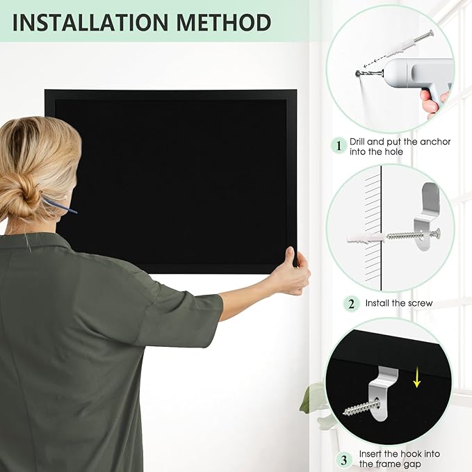 • [Package Include] 24''x 18'' Black bulletin board with linen, 10 pushpins, and 10 clips. Installation hardware is all provided. The hanging hook can be easily installed on any frame.