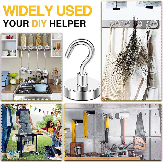 • 【Versatile Use】Super strong neodymium 80 lb magnets with hooks are perfect for hanging grill tools, decorative lights and tool accessories, also be widely used in cruise, fridge, kitchen, workplace office, garage, indoor, outdoor and anywhere there is iron or steel. No drilling holes, No sticky residue, No bolt or screws; Easy to install or remove and reusable.