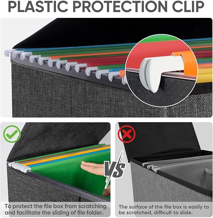 • [UNIVERSAL SIZE] Our file box with lid fits letter-sized files. It is designed for efficiency and functionality, with its smooth PVC slide rails on both sides, you can effortlessly slide file folders for easy access and neatly arranged. The lid fits snugly on the box after hanging folders. (NOTE: file folders are not included)