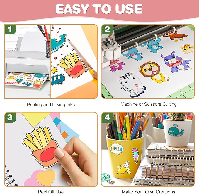 • Easy to Use: Compatible with most laser and inkjet printers, such as Brother, Canon, Epson, HP, etc. We just put it directly into the printer. In addition, it fit for processing knives and easy to engrave different sticker patterns.Unique backing layer makes peeling a breeze, while premium glue makes application easy and smooth.