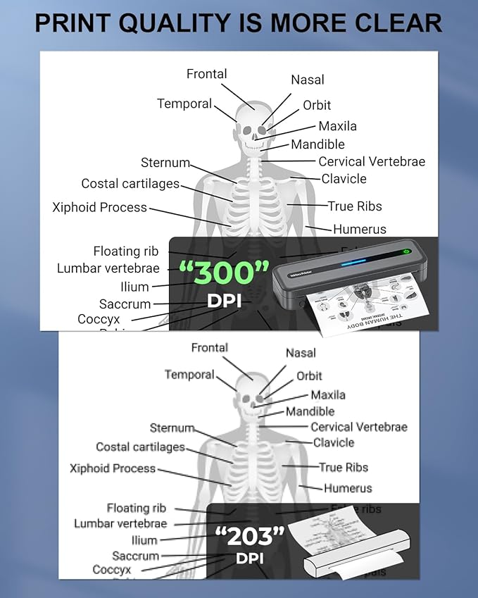 - CRISP PRINTS & USER-FRIENDLY: Our wireless thermal printer is 300DPI, beating most of the mini thermal printers on the market is 203DPI. Prints are sharper and clearer! And Installing and using mini portable printer just in 1 minute.