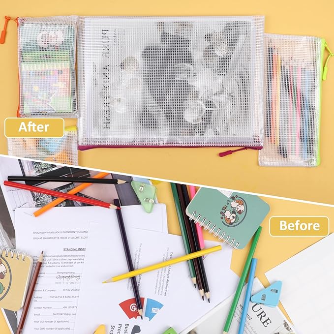 • PACKAGE CONTAINS:20pcs clear pouches for organizing: 2xB4 (15.6 x 11.2 inches), 2xA4 (13.6 x 9.6 inches), 2xB5 (11.6 x 8.4 inches), 2xA5 (9.4 x 6.8 inches), 2xB6 (7.8 x 5.6 inches), 2xA6 (7 x 4.8 inches), 4xBills (9.4 x 4.2 inches), 4xB8 (5.4 x 3.8 inches).Storage bags store teaching supplies such as pencils, books, rules, include handwork collection