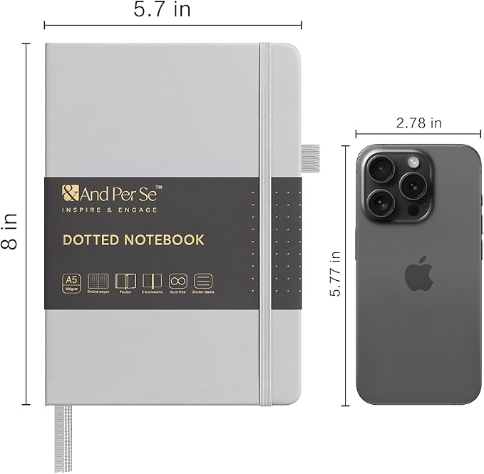 &And Per Se Dotted Journal Notebook, A5 Hardcover Leather Bullet Dotted Journal, 160 Pages 100 gsm Thick Dotted Paper,3 Sheets of Stickers Included - 5.7'' x 8''(Grey)