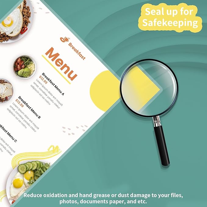 - πSEAL UP FOR SAFEKEEPING: Laminating sheets is made of high-quality PET film + EVA adhesive layer, strong adhesion, flat and not easy to generate air bubbles, and can be stored for a long time. Laminating paper can reduce damage to documents, photos, paper, etc. caused by hand grease or dust, and oxidation loss.