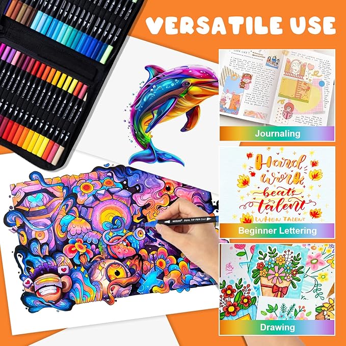 • 【SMOOTH, NONTOXIC INK】Nicecho dual brush marker set come with high-quality water-based ink that flows smoothly. The ink's vibrant colors seamlessly blend, providing beautiful and consistent coloring effects without smudges.