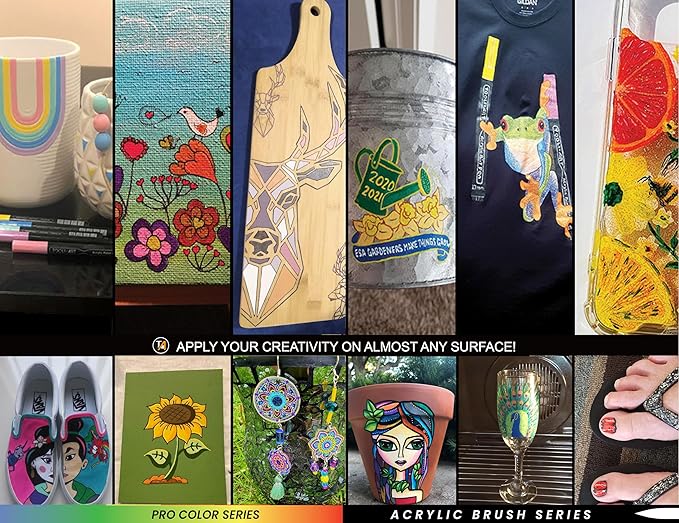 - ✔️SUPERB QUALITY – The highly pigmented ink gives you a fantastic opaque coverage. The fade-resistant ink dries quickly and works great on dark and light surfaces. The multi-surface paint works on most surfaces including stone, glass, wood, metal, fabric, porcelain, canvas, plastic, paper, cardboard, pottery, shoes, shirts, etc. and is perfect for any DIY project, brush lettering, calligraphy, rock painting, and more!