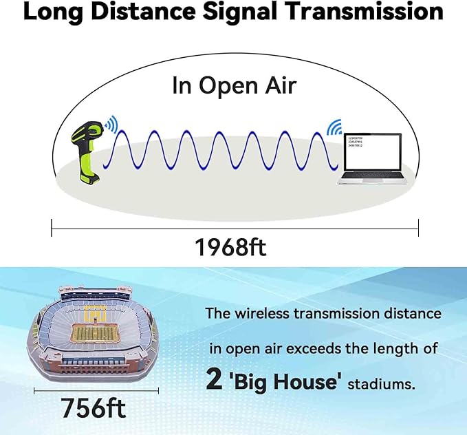 - 【Exceptional Signal Range】 The Alacrity 433MHz RF wireless barcode scanner stands out with its long-distance transmission capabilities. In an unobstructed environment, it can transmit signals up to an impressive 1968 feet (600 meters), and even in environments with obstacles, it reaches a substantial 656 feet (200 meters). This extended range makes it a perfect fit for large warehouses where signal coverage is crucial.