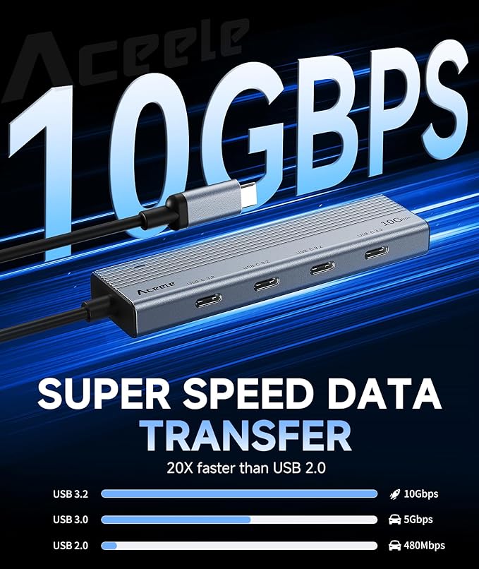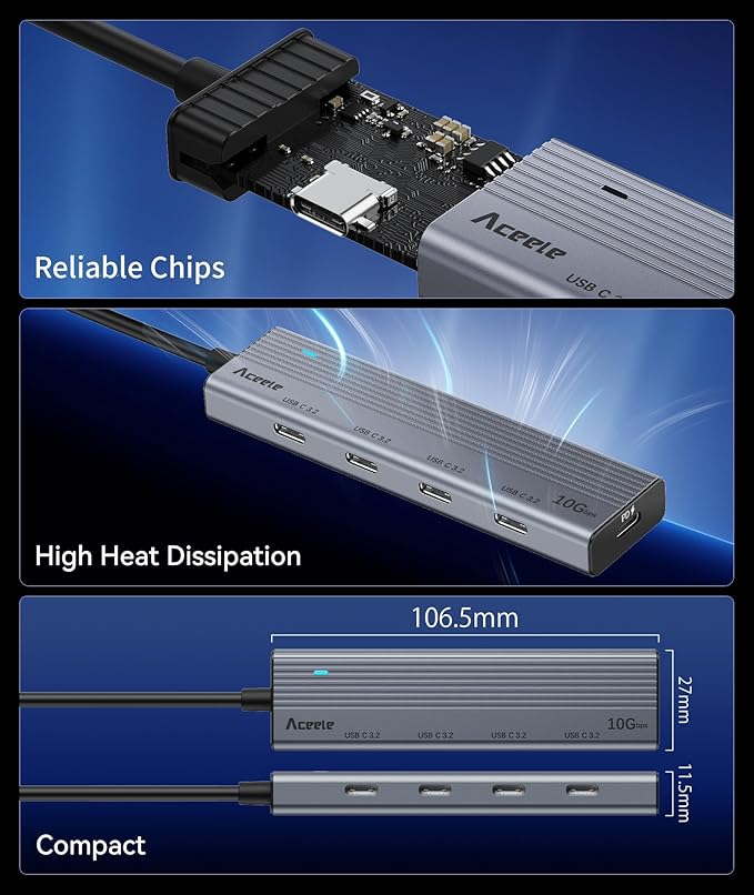 - [Compact USB C 3.2 Gen 2 Hub] Aceele's USB C Hub Splitter features 4 USB C data ports, allowing simultaneous use to meet daily needs. Please note: None of the ports support external monitors.