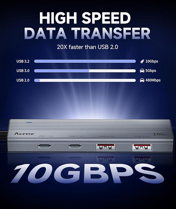 - 【Small & Lighting USB C 3.2 Gen 2 Hub】Aceele USB C 3.2 Splitter has 4 USB C data ports (including 2x USB A and 2x USB C ports ), 4 USB ports can be used at the same time, to meet your daily needs. NOTE: All Ports Not Support Monitor.