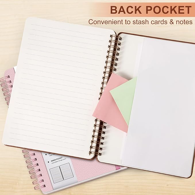 - Sturdy Spiral Twin-wire Binding & Inner Pocker: Feature a sturdy double spiral coil binding, the journaling notebooks are easy to flip the pages, flat and fold. Perforated inside pages allow to tear off unwanted pages. The back cover of the notebook journal includes an expandable pocket to store small objects. The elastic band on the outside of the lined notebook can also help you fix and mark pages perfectly. Perfect spiral bound journal notebooks for work, college supplies.