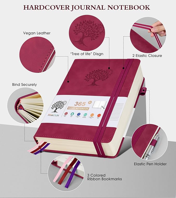 - 【365 Pages Premium Thick Paper】: Our PERCUN lined journal notebook is made of 365 pages high-quality 100Gsm thick ruled pager with an acid-free light Ivory paper that is thicker than normal. This premium quality paper will not cause bleeding, ghosting or smudging and is suitable for most types of pens,provides ample space for journaling, note-taking, and creative writing. The line spacing is 7mm, making it easy to write legibly and neatly.