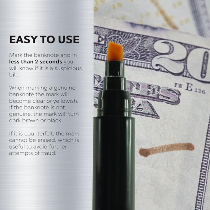 • Instant Verification Pens: The 5-pack counterfeit bill detector pens provide immediate verification in just 2 seconds, ensuring you can quickly check currency authenticity anywhere.