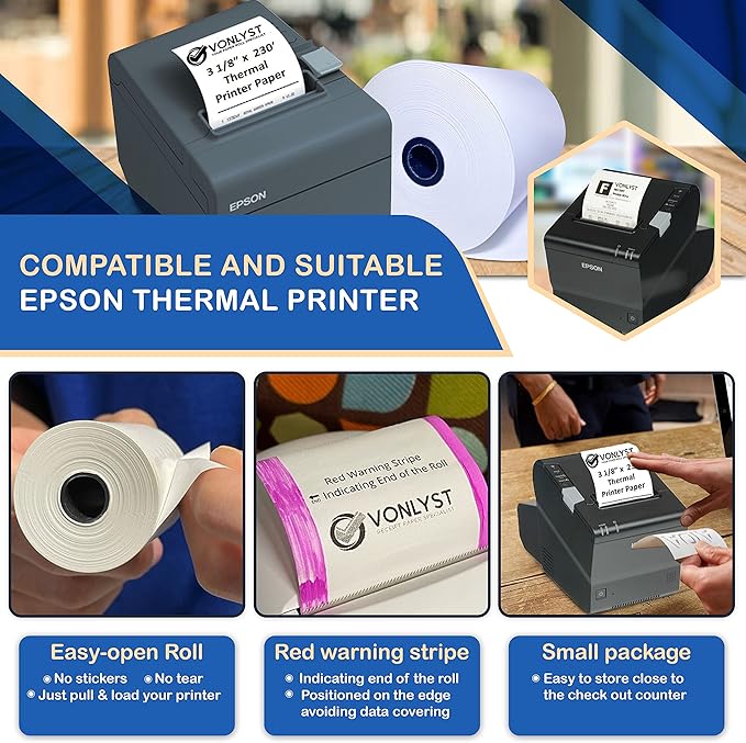 - PAPER ROLL SIZE designed to maximize the performance of your Epson Receipt Printer Vonlyst thermal receipt paper rolls are precisely manufactured in size of 3 1/8” x 230’ (width x length)