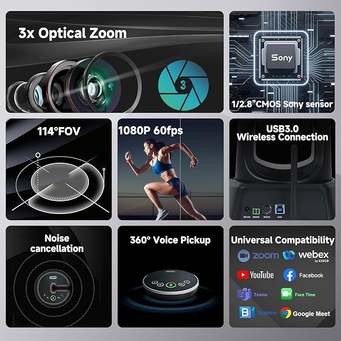 - 3X 5.8G WIRELESS 1080P 60FPS USB3.0 PTZ camera Bundle with Speakerphone offers Easier Video and Audio Solutions. TONGVEO wireless live streaming camera comes with a 5.8GHz USB receiver, for a 50ft transmission range allowing for flexibility in positioning. so you can expect clear, undistorted online working. The speakerphone provides 360° voice enhancement while effectively eliminating background noise, ensuring a professional and distraction-free business conference experience.