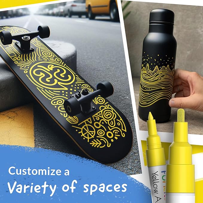 • Yellow Metallic Paint Markers - Enjoy creating art & craft projects on. Shoe, leather, furniture, clothing, sneaker, porcelain, polymer clay, kindness rocks, tire marker, yellow paint pens for metal.