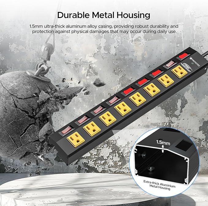 - [Comprehensive Protection] Featuring 1200 joules of surge protection, this metal power strip safeguards your electronic devices against power surges, spikes, and outages. The 15 amp circuit breaker ensures instant response to catastrophic events and overloads, providing maximum protection. The included 14AWG UL listed extension cord with a 3-hole grounded plug enhances safety.