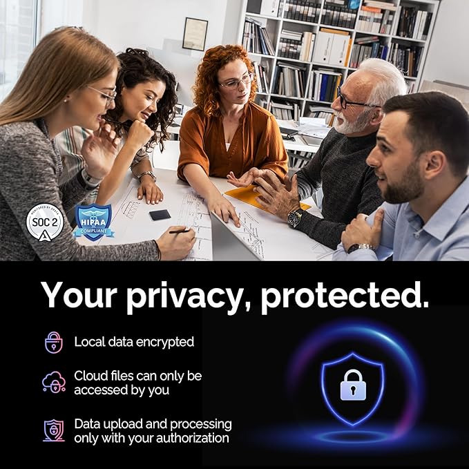 - YOUR PRIVACY COMES FIRST: Local data encrypted, cloud files exclusive to you, with data processing only upon your authorization. PLAUD App and Web portal offer unlimited cloud storage. Effortlessly manage audio files, sort them, and share recordings, transcriptions, and summaries with ease. Enhances team collaboration through transcription and summarization features