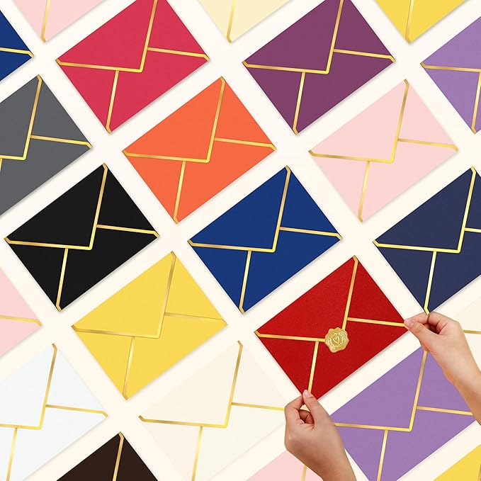• Compatibility: you will receive 60 pack delicate A7 envelopes ( 5.3"x7.3"), and more than 60 pcs gold self-adhere seals,the 5x7 envelopes are acceptable to put in 5x7 / 4x6 /3x5 inch cards, and the cards in size of A5/A6/A7/A8. Other bigger sizes are NOT acceptable