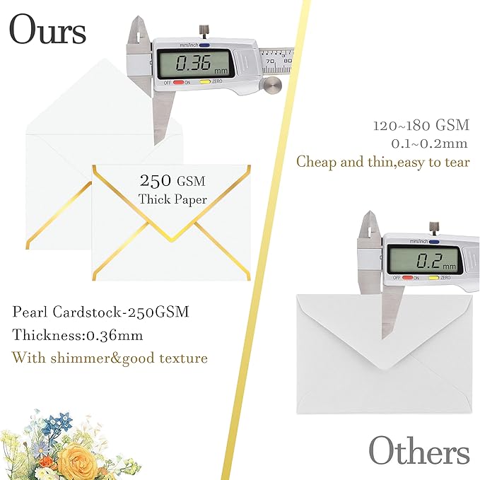 • Thicker and more elegant: The gold envelopes 5x7 are made of luxury 250gsm pearl cardstock,with shimmer and good texture. Thick and stiff, much thicker than average envelopes, not easy to bend,break or fade