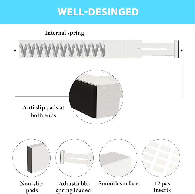 • DRAWER FRIENDLY DESIGN: The ends of our drawer dividers feature non-slip pads to keep them in place and protect your drawers from scratches, keeping your utensils, clothes and cosmetics safe enough