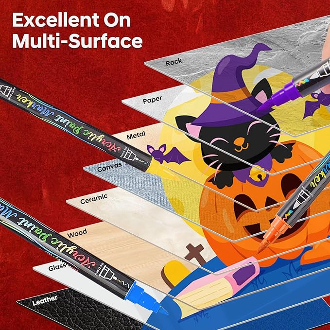 - EXCELLENT ON MULTI-SURFACE: Lammyner paint pens acrylic markers work on almost all surfaces, such as paper, rocks, metal, mugs, canvas, fabric, ceramic, models, glass, wood, plastic, leather, clothing, shoes, resin, tires, jars labels, Halloween Pumpkin, Christmas ornament, decoration to graffiti, card making, Easter eggs, birthday gifts, or any DIY crafts projects, and much more for both smooth surfaces. And the acrylic paint markers set can provide consistent, opaque coverage to unlock your artistic potential.