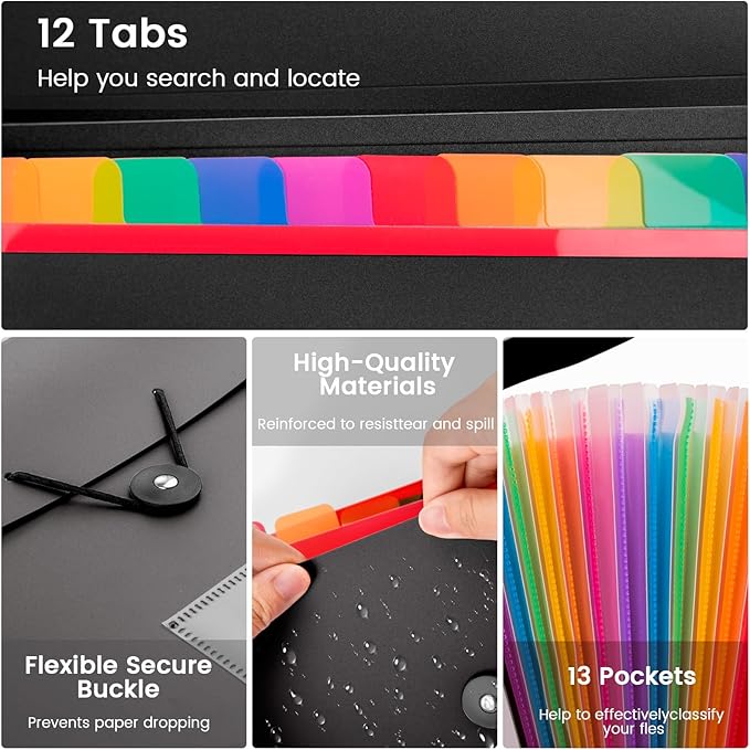 • 【6-PACK EXPANDING FOLDER】13-pocket accordion file folder, available in six vibrant colors: black, blue, blue-purple, purple, yellow, and pink, ensures efficient organization by subject, securely storing all your essential documents for easy access