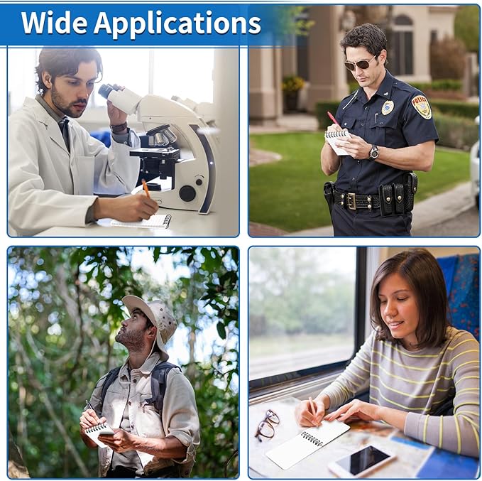 • POCKET SIZE: Waterproof pocket notepad measures 3×5 inches. The small pocket size and sturdy design can be used as a police notepad, golf notebook, diary, memo, field book, or notepad. With a ruler printed on the pocket notebook back