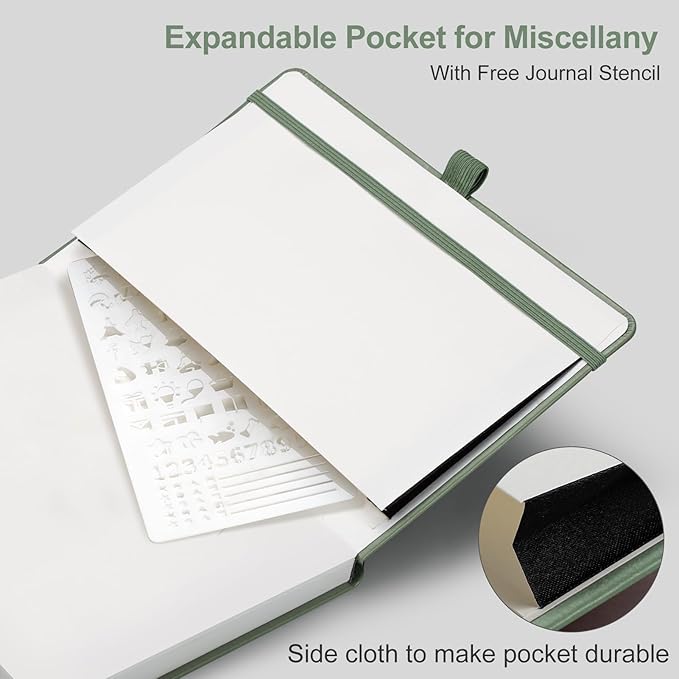 - CONVENIENT AND PRACTICAL LAYOUT: Features a pen holder for easy access to your pen, an elastic band to keep your notebook securely closed, 2 bookmarks for quick page referencing, an inner pocket for storing loose papers, and 2pcs journal stencils for additional creativity