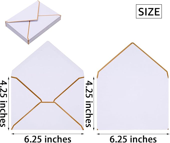 • Package Includes: A4 white envelope kit contains 50 pieces 4.25x6.25in blank envelopes with gold border; Self-adhesive envelopes suit for your 4"×6" greeting cards, wedding invitations, business notes etc.