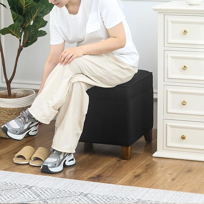 Adeco 17.5" Square Fabric Ottoman with Storage - Upholstered Cotton Linen Foot Rest - Flip Top Footstool with Sturdy Wood Legs, Small Cube Coffee Table Extra Seat for Living Room, Bedroom, Black