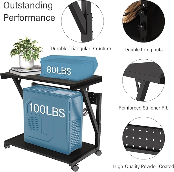 - 𝐌𝐮𝐥𝐭𝐢𝐟𝐮𝐧𝐜𝐭𝐢𝐨𝐧𝐚𝐥 𝐃𝐞𝐬𝐢𝐠𝐧: The gaming riser mount features a 2-tier standing design, with the bottom shelf for the computer tower and the top shelf for printer, monitor, laptop and various office desk accessories. Additionally, it includes a pegboard for organizing accessories. The PC stand can also be used as a mobile laptop standing desk or printer stand with storage.