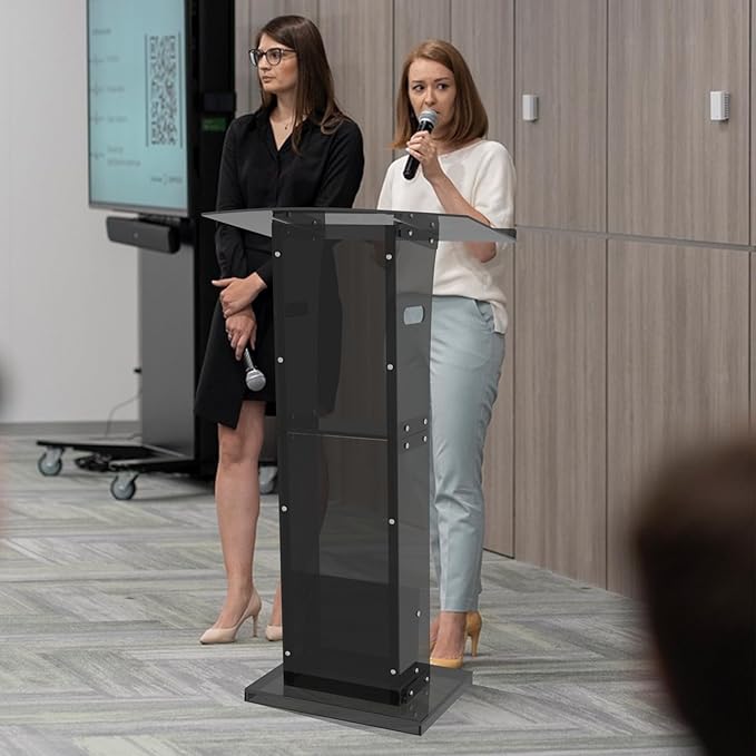 Acrylic Podium Stand with Storage Shelf,Segmented Black Lecterns & Podiums,Pulpits for Churches、Conference、Speeches、Weddings、Classroom、Concert,43" H Professional Presentation Podiums