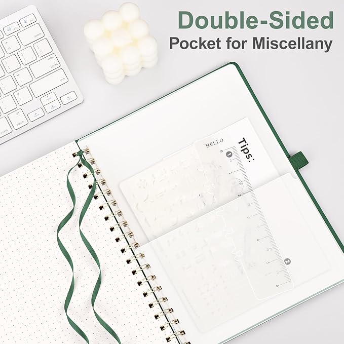 - PRACTICAL LAYOUT: Equipped an elastic band, a pen holder and removable bookmark ruler to keep your notebook organized. Comes with a DIY bookmark with a ribbon for self-attachment to the spiral, serving as a bookmark. Features a double-sided pocket for storing miscellany and 18pcs sticky notes for additional organization and reminders