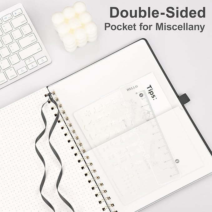 - PRACTICAL LAYOUT: Equipped an elastic band, a pen holder and removable bookmark ruler to keep your notebook organized. Comes with a DIY bookmark with a ribbon for self-attachment to the spiral, serving as a bookmark. Features a double-sided pocket for storing miscellany and 18pcs sticky notes for additional organization and reminders