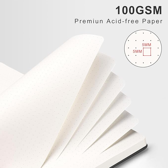 - 100 GSM PREMIUM PAPER: Our dotted notebook adopts 100 GSM acid-free thick paper in a light ivory color, ink-friendly, and prevents ghosting and feathering, making it perfect for various pens, including fountain pens, pencils, ballpoint and gel