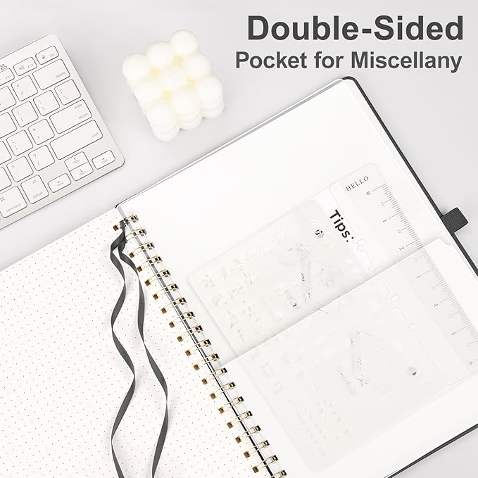 - PRACTICAL LAYOUT: Equipped an elastic band, a pen holder and removable bookmark ruler to keep your notebook organized. Comes with a DIY bookmark with a ribbon for self-attachment to the spiral, serving as a bookmark. Features a double-sided pocket for storing miscellany and 2pcs journal stencil for adding creative to your pages