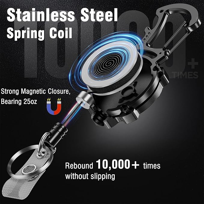 - [Multi-function tool] Cool tactical badge reel with key chain ring and ID badge clip not only can hang work ID name badge holder, keys, gadget buddy accessories, but also can help you open the beer cap smoothly. It can be fixed on belts, backpacks, handbags, outdoor tents. It aslo makes a great practical present for men, boyfriends, family, friends