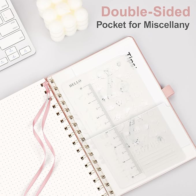 - PRACTICAL LAYOUT: Equipped an elastic band, a pen holder and removable bookmark ruler to keep your notebook organized. Comes with a DIY bookmark with a ribbon for self-attachment to the spiral, serving as a bookmark. Features a double-sided pocket for storing miscellany and 2pcs journal stencil for adding creative to your pages