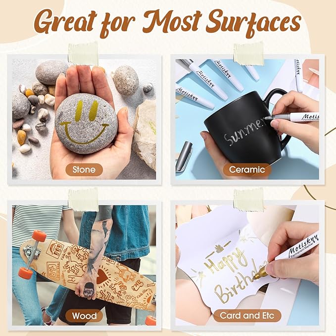 • Quality Material: metallic permanent markers are made of water based ink, The point is fine, the writing is smooth, the color is vibrant, and the metallic luster is emitted; Suitable for opaque light and dark surfaces