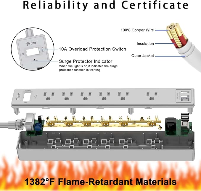 6Ft Power Strip Surge Protector - Yintar Extension Cord with 6 AC Outlets and 3 USB Ports for Home, Office, Dorm Essentials, 1680 Joules, ETL Listed, Grey