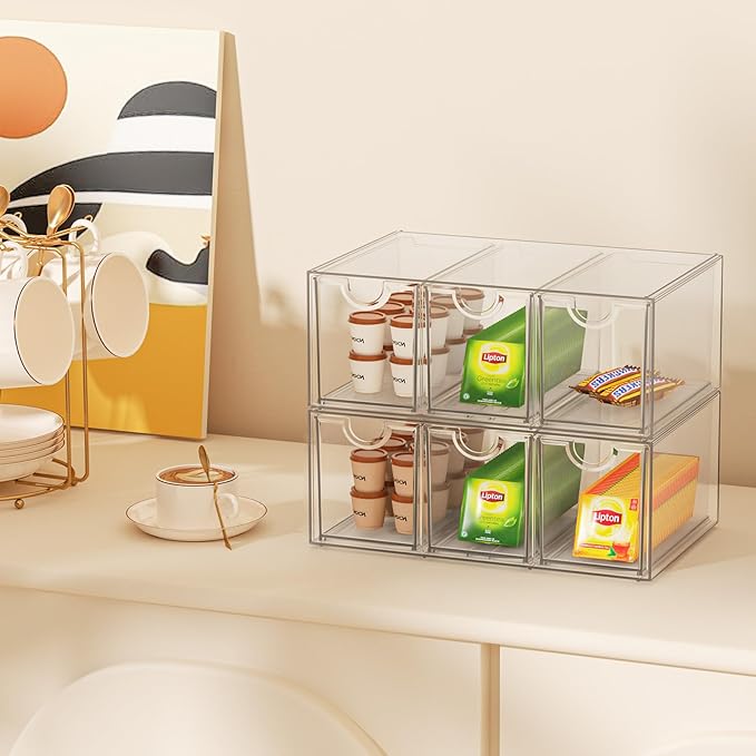 - Flexible Combination: Total 2 sets storage organizers with 6 drawers,You can flexibly use our storage organizer for house organization and storage according to your needs , The storage containers are stackable, with silicone mat, vertical storage will save a lot of space. You can also use them side by side. Put your small objects on top of acrylic bins to make your countertop space more tidy.