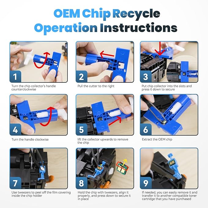 • No Chip: These 218X toner cartridges do not have chips but with DIY tool. Please remove the old original chip and install it into our toner cartridge (tools already included)