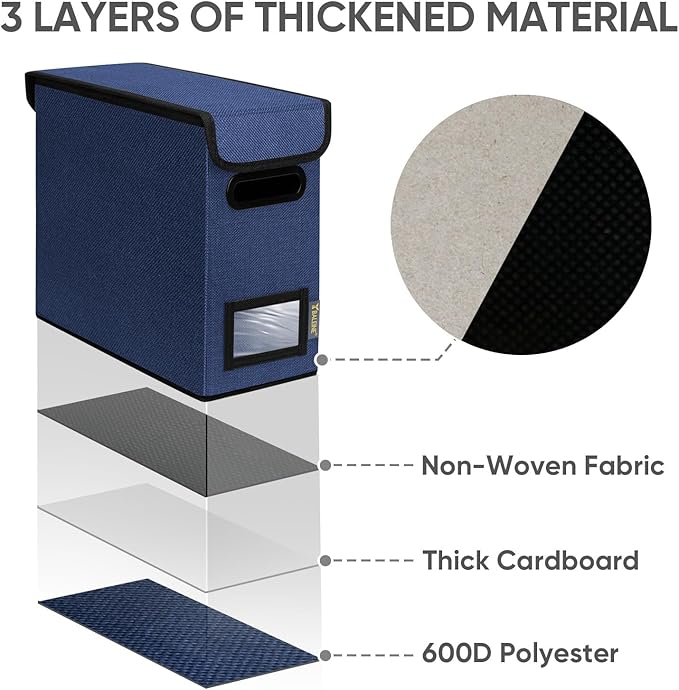 - [DURABLE MATERIAL] The outer layer of our filing box is crafted from high-quality polyester fabric and reinforced with thick cardboard in the middle. This construction ensures that the box maintains its shape and provides better bearing capacity for important documents and files. Its textured appearance can also serve as a stylish decorative element in any office or home