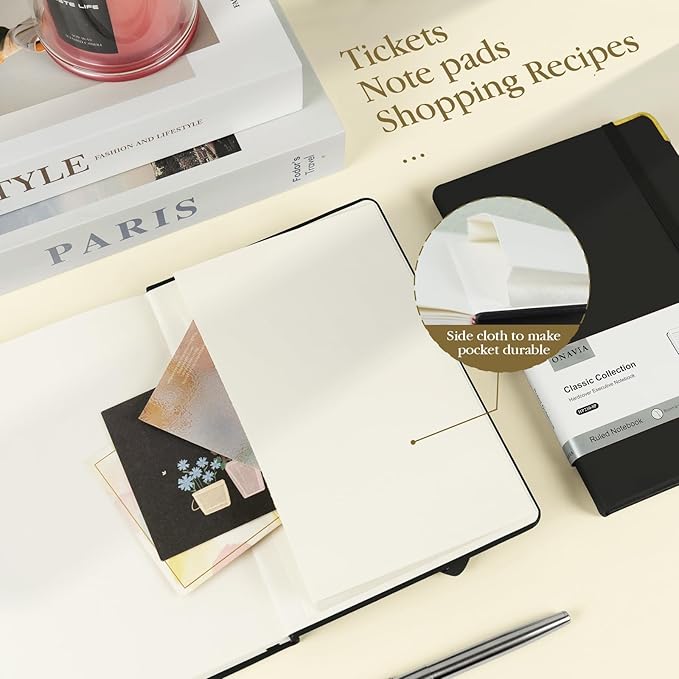 - Humanity Detail Design: A5 Hardcover Journal Note Books feature an elastic pen loop, making it more convenient to carry pens of various sizes. The elastic closure band let the hardcover notebook open and close freely. 1 Expandable inner pocket can easily store notes, bills, receipts, appointment cards, and more. And 1 ribbon bookmark helps quickly find the correct page