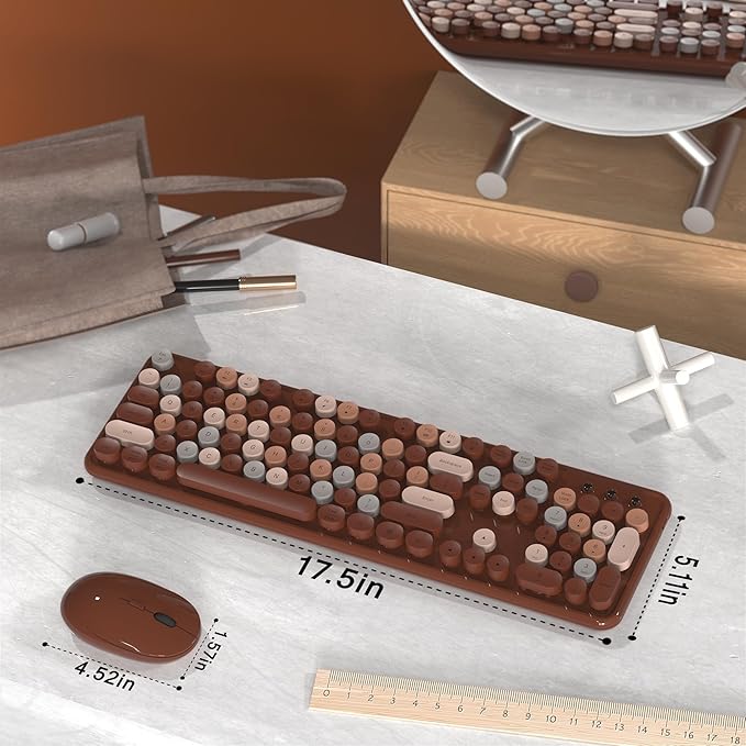 Colorful Wireless Computer Keyboard and Mouse Combo with Round Typewriter Keycaps, Retro Design, Power Switch, Ergonomic Design, 2.4GHz Wireless for Windows, Mac, PC(Coffee-Colorful)