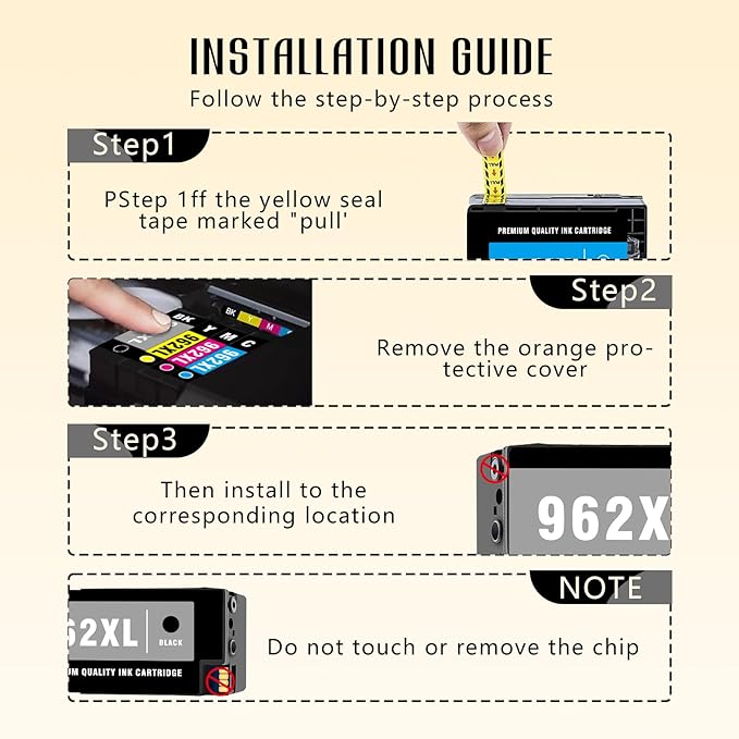 - --For hp 962xl ink cartridges combo pack / 962xl ink cartridges combo pack with latest upgraded chip --note: for hp 962xl ink cartridges combo pack latest upgrade ink cartridges100% Compatible With Printers Which Actived For HP+ service, and Compatible With *e Series Printers.Before placing an order, please ensure that your printer is compatible for hp 962XL or 962 ink cartridge to prevent any inconvenience during the printing process