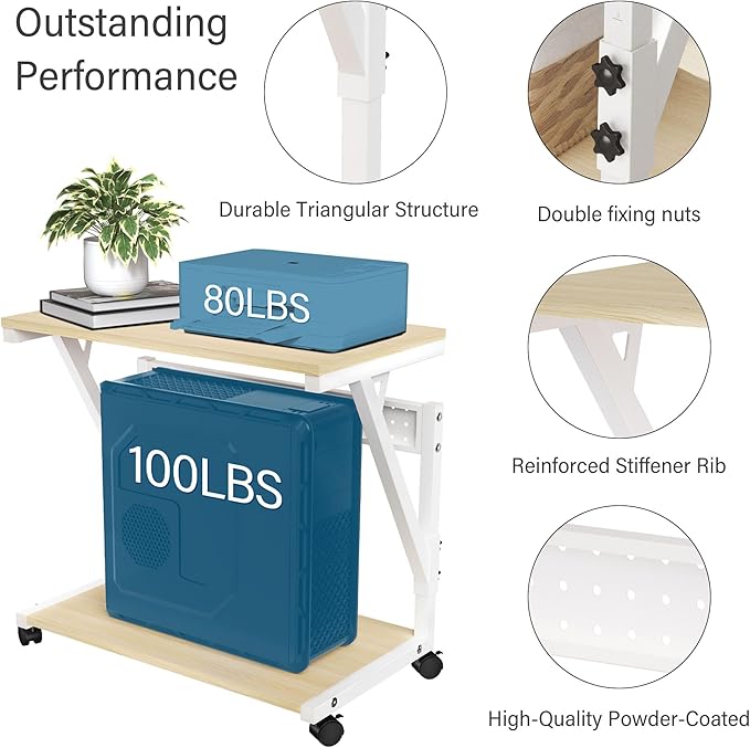 - 𝐌𝐨𝐛𝐢𝐥𝐢𝐭𝐲 𝐚𝐧𝐝 𝐒𝐭𝐚𝐛𝐢𝐥𝐢𝐭𝐲: The rolling cart equipped with four 360-degree rotating wheels with brakes, the computer tower stand ensures smooth movement on different surfaces while providing stability, even when fully loaded. The design reduces carpet prints, indentations, and makes it easy to clean the floor.