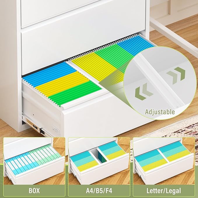 - 【Unique design】Lateral file cabinet is fully suspended drawer system with ball bearings makes the switching operation easy and noiseless, which it friendly for others to work with and always keeps a quiet environment. Non-mar padded base prevent from sliding and scratching floors.