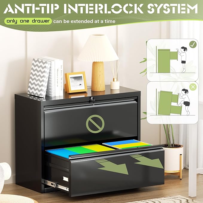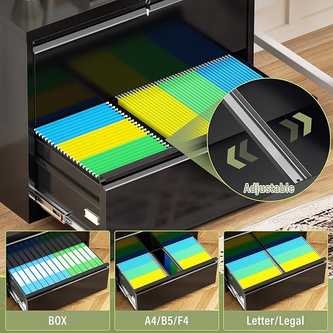 - 【Unique design】Lateral file cabinet is fully suspended drawer system with ball bearings makes the switching operation easy and noiseless, which it friendly for others to work with and always keeps a quiet environment. Non-mar padded base prevent from sliding and scratching floors.
