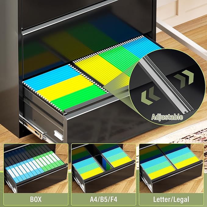 - 【Unique design】Lateral file cabinet is fully suspended drawer system with ball bearings makes the switching operation easy and noiseless, which it friendly for others to work with and always keeps a quiet environment. Non-mar padded base prevent from sliding and scratching floors.
